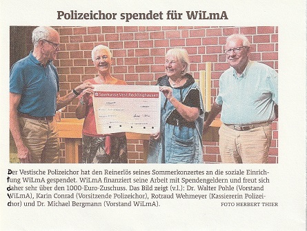 Anfang September fand das Jubiläumskonzert des Vestischen Polizeichors statt. Durch die Einnahmen und weitere Spenden kam eine Summe in Höhe von 800 Euro zusammen. Der Erlös kommt der gemeinnützigen Einrichtung „BARKE gGmbH“ zugute.